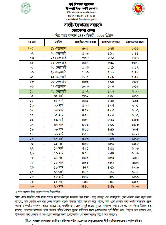 নেত্রকোনা জেলার রোজার ক্যালেন্ডার ২০২৬ | নেত্রকোনা জেলার সেহরি ও ইফতারের সময়সূচি ২০২৬