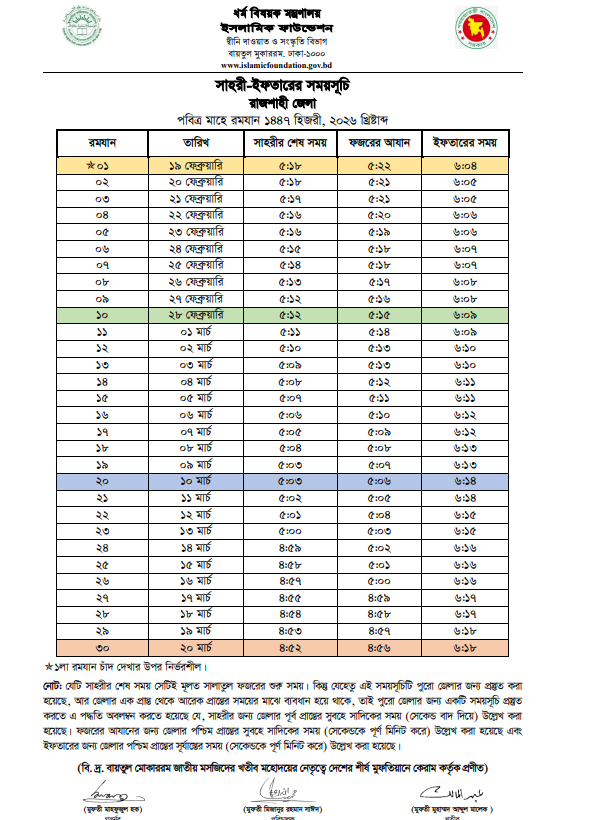রাজশাহী জেলার সেহরি ও ইফতারের সময়সূচি ২০২৬